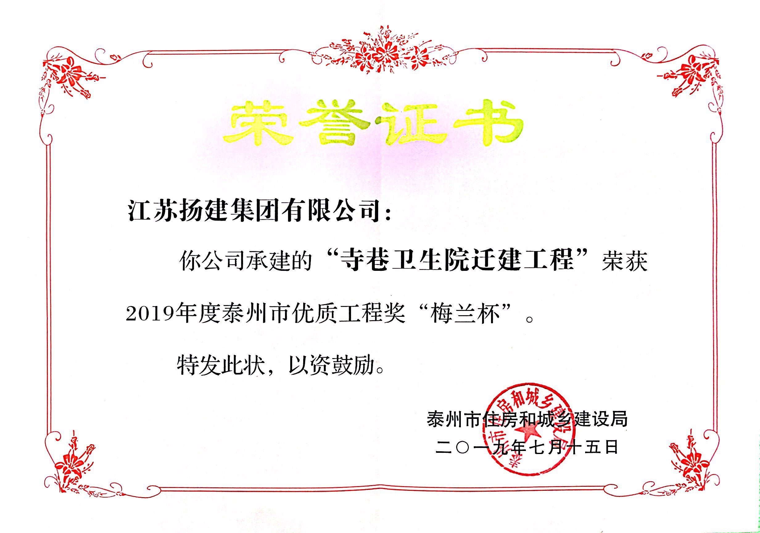 揚建網(wǎng)訊 泰州市住房和城鄉(xiāng)建設(shè)局近日公布了2019年度泰州市優(yōu)質(zhì)工程獎“梅蘭杯”獲獎項目名單。我集團承建、華發(fā)公司參建的寺巷衛(wèi)生院遷建工程榮獲泰州市“梅蘭杯”優(yōu)質(zhì)工程獎。