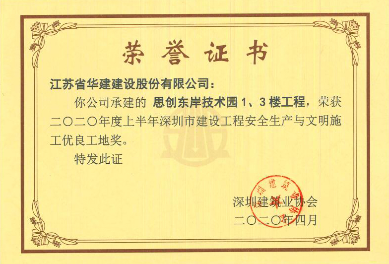 又訊:深圳工程處承建的寧佳花園工程被評(píng)為“2020年廣東省建設(shè)工程金匠獎(jiǎng)”及廣東省建設(shè)工程優(yōu)質(zhì)獎(jiǎng);思創(chuàng)東岸技術(shù)園1、3號(hào)樓工程榮獲2020年上半年深圳市建設(shè)工程安全生產(chǎn)與文明施工優(yōu)良工地獎(jiǎng)。