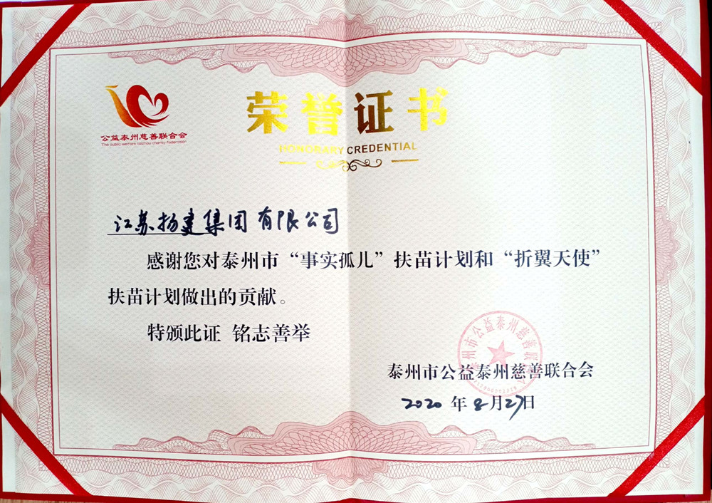 揚(yáng)建網(wǎng)訊 8月27日,集團(tuán)公司積極參與泰州市“事實(shí)孤兒”扶苗計(jì)劃和“折翼天使”扶苗計(jì)劃,受到泰州市公益泰州慈善聯(lián)合會(huì)的表彰。