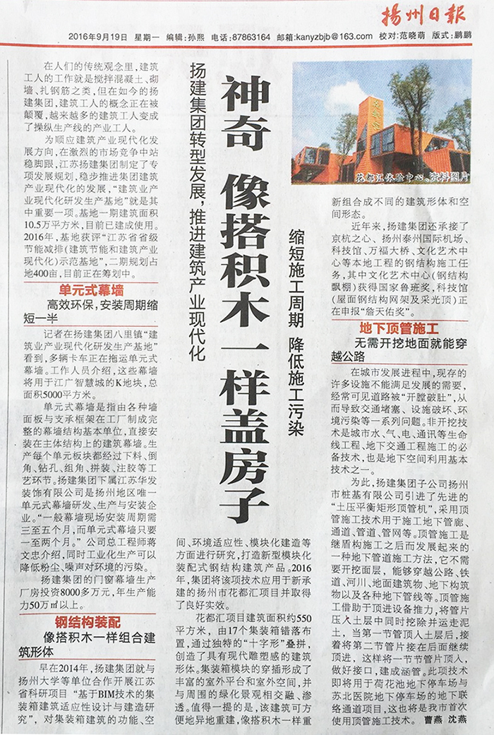 揚(yáng)建網(wǎng)訊(創(chuàng)優(yōu)辦 姜曉花)9月19日,《揚(yáng)州日?qǐng)?bào)》第三版專題報(bào)道了我集團(tuán)建筑工業(yè)現(xiàn)代化應(yīng)用情況。與此同時(shí),揚(yáng)州電視臺(tái)新聞?lì)l道也就我集團(tuán)在荷花池水下停車場施工過程中新技術(shù)的應(yīng)用以及揚(yáng)建集團(tuán)建筑工業(yè)現(xiàn)代化生產(chǎn)基地的建設(shè)等情況作出了專題報(bào)道。
