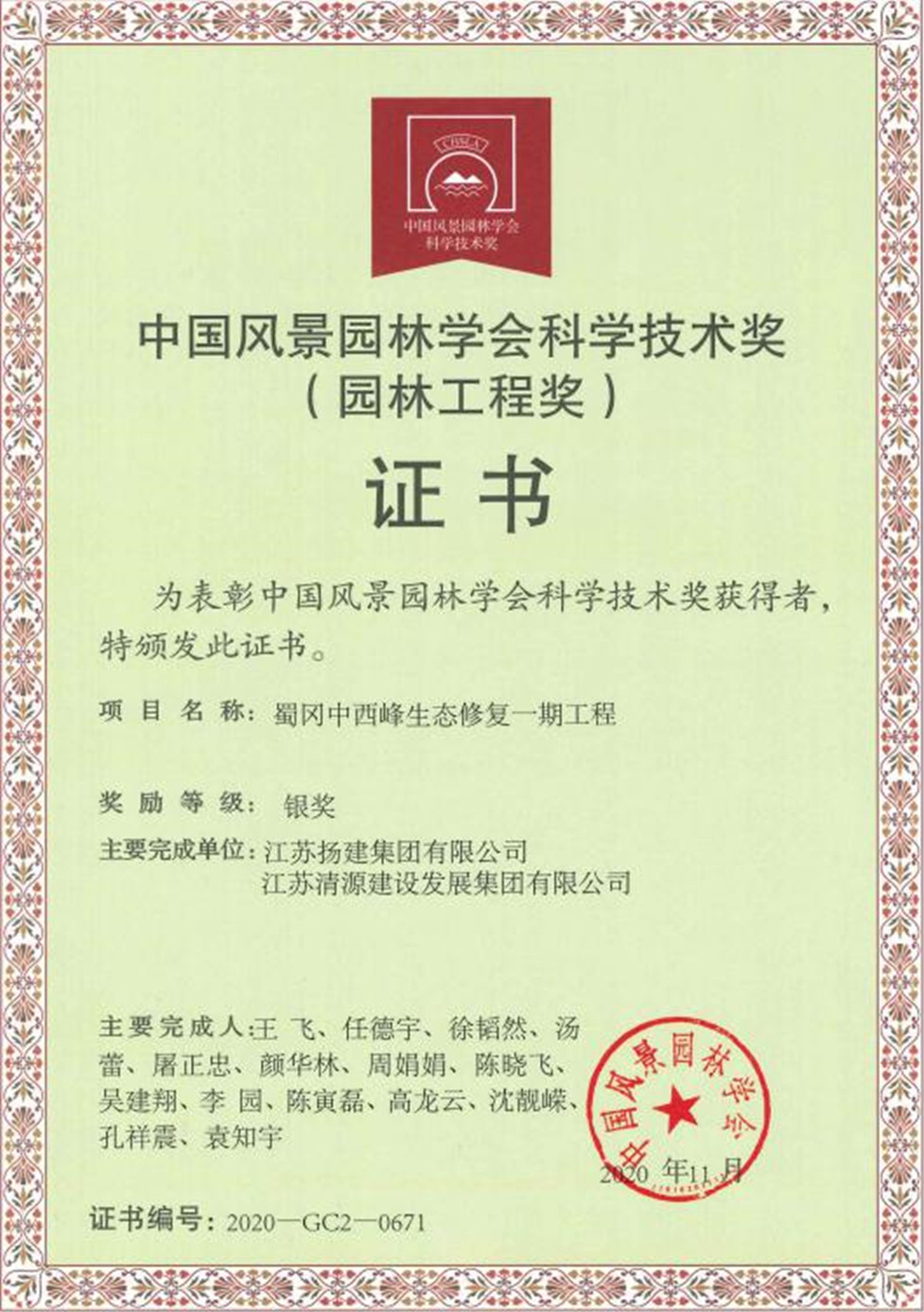 揚(yáng)建網(wǎng)訊 近日,集團(tuán)公司主申報(bào)的“蜀岡中西峰生態(tài)修復(fù)一期工程”獲得了中國(guó)風(fēng)景園林學(xué)會(huì)授予的“2020年度中國(guó)風(fēng)景園林學(xué)會(huì)科學(xué)技術(shù)獎(jiǎng)(園林工程獎(jiǎng))銀獎(jiǎng)”。風(fēng)景園林科技獎(jiǎng)獎(jiǎng)勵(lì)對(duì)象為在推動(dòng)我國(guó)風(fēng)景園林各領(lǐng)域科技進(jìn)步、科技創(chuàng)新和科技推廣中做出突出貢獻(xiàn)的單位和個(gè)人,該獎(jiǎng)項(xiàng)也是集團(tuán)公司施工的園林綠化項(xiàng)目在風(fēng)景園林科技領(lǐng)域獲得的最高獎(jiǎng)項(xiàng)。