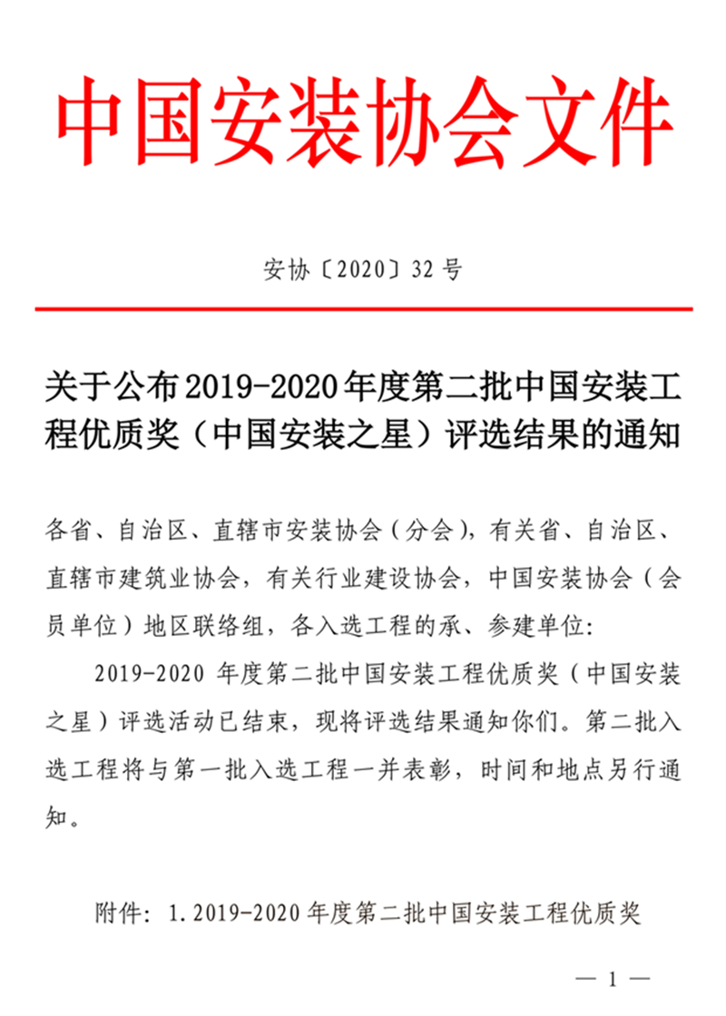 揚建網訊 日前,中國安裝協會公布了2019-2020年度第二批中國安裝工程優(yōu)質獎(中國安裝之星)評選結果,由集團機電分公司和環(huán)保公司共同申報的“江廣智慧城F地塊項目、K地塊項目工程施工(F地塊項目)安裝工程”和“TPI風機葉片生產廠房建設工程安裝工程”榮獲年度“中國安裝之星”稱號,這也是繼安裝產業(yè)板塊參建的新建萬福大橋工程和揚州中學教育集團樹人學校高中部榮獲“國家優(yōu)質工程獎”后,再一次捧回“國字號”質量獎項。
