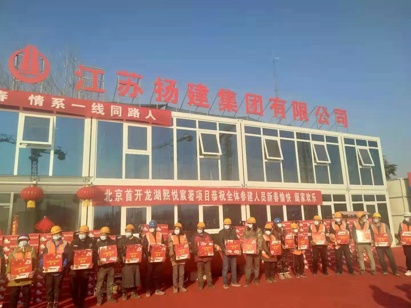 揚建網(wǎng)訊 2月9日上午10時許,北京熙悅宸著項目業(yè)主龍湖地產(chǎn)集團北京公司常務副總經(jīng)理陳明偉、副總經(jīng)理張長明、首開地產(chǎn)北京公司副總經(jīng)理李捷等一行冒著嚴寒、風塵仆仆來到項目現(xiàn)場,親切看望和慰問就地過年的農(nóng)民工和項目管理人員,向奮戰(zhàn)在一線的400多名揚建建設(shè)者致以誠摯問候和新春祝福,帶去了滿滿的春節(jié)“年貨”。集團北方公司總經(jīng)理許世明、副總經(jīng)理吳勇陪同慰問項目全體員工,并檢查項目部春節(jié)前各項工作。