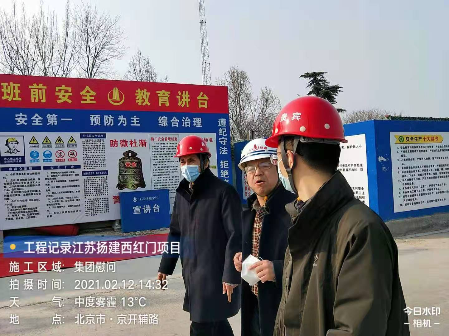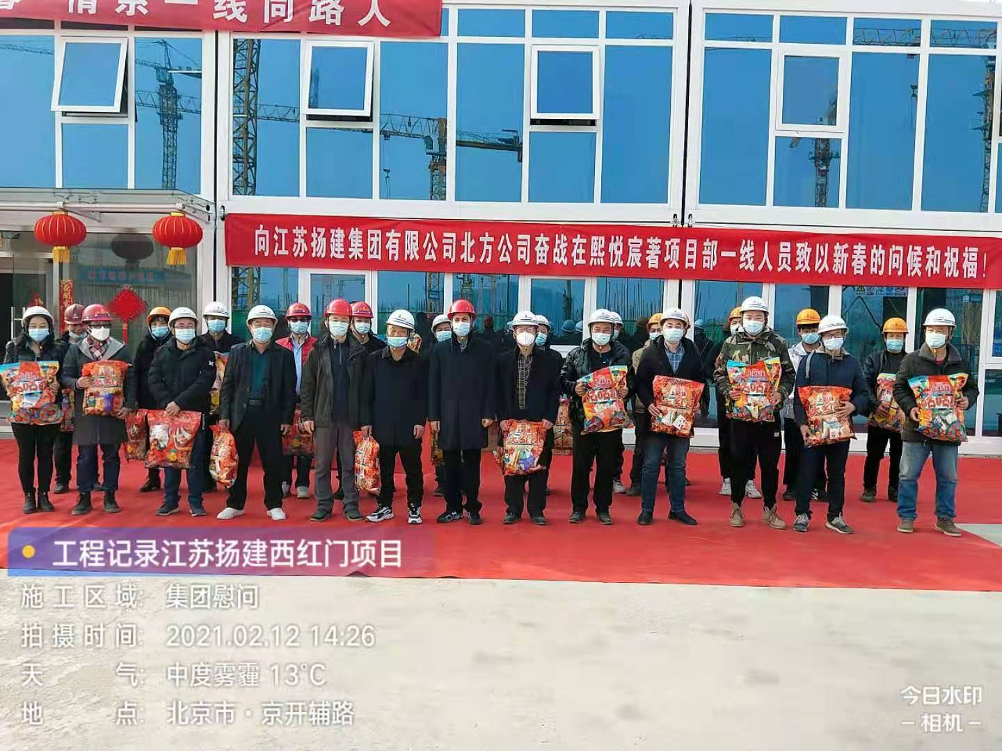 揚(yáng)建網(wǎng)訊 2月12日,農(nóng)歷大年初一,正是萬家團(tuán)聚、喜慶佳節(jié)的時(shí)候,江蘇省人民政府駐北京辦事處建筑管理處處長(zhǎng)錢明、副處長(zhǎng)程剛走進(jìn)北京熙悅宸著項(xiàng)目部,看望慰問春節(jié)期間響應(yīng)國家就地過年號(hào)召、仍奮戰(zhàn)在一線的400多名揚(yáng)建建設(shè)者,為在寒冷冬日下堅(jiān)守在生產(chǎn)一線的建設(shè)者們送上暖心年貨。北方公司副總經(jīng)理吳勇陪同慰問。