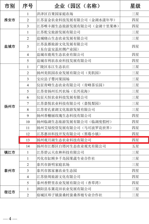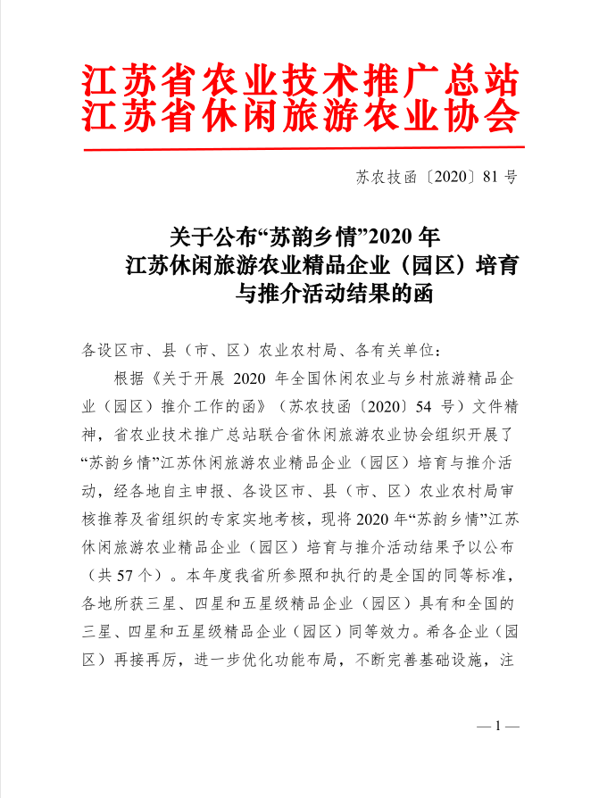 揚(yáng)建網(wǎng)訊 日前,省農(nóng)業(yè)技術(shù)推廣總站、休閑旅游農(nóng)業(yè)協(xié)會(huì)聯(lián)合下發(fā)文件,揚(yáng)州市觀月湖生態(tài)農(nóng)業(yè)科技有限公司順利通過(guò)“蘇韻鄉(xiāng)情”2020年江蘇休閑旅游農(nóng)業(yè)精品企業(yè)(園區(qū))“四星”驗(yàn)收。該評(píng)星的通過(guò),將為園區(qū)后期發(fā)展農(nóng)旅產(chǎn)業(yè)提供強(qiáng)有力的支持。