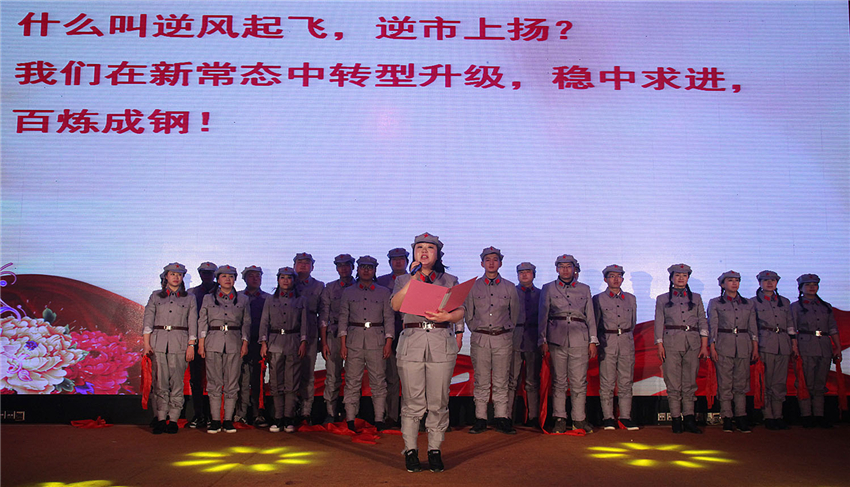 在華達公司員工表演的開場鼓《揚門女將》節(jié)目之后,曹德榮董事長以上聯(lián)“榮升特級、躋身百強,再接再厲奮步十三五”、下聯(lián)”深入轉型、持續(xù)創(chuàng)新,群策群力共鑄新輝煌”、橫批“新起點新跨越”的春聯(lián),回顧過去、展望未來,并作了熱情洋溢的新春賀詞。