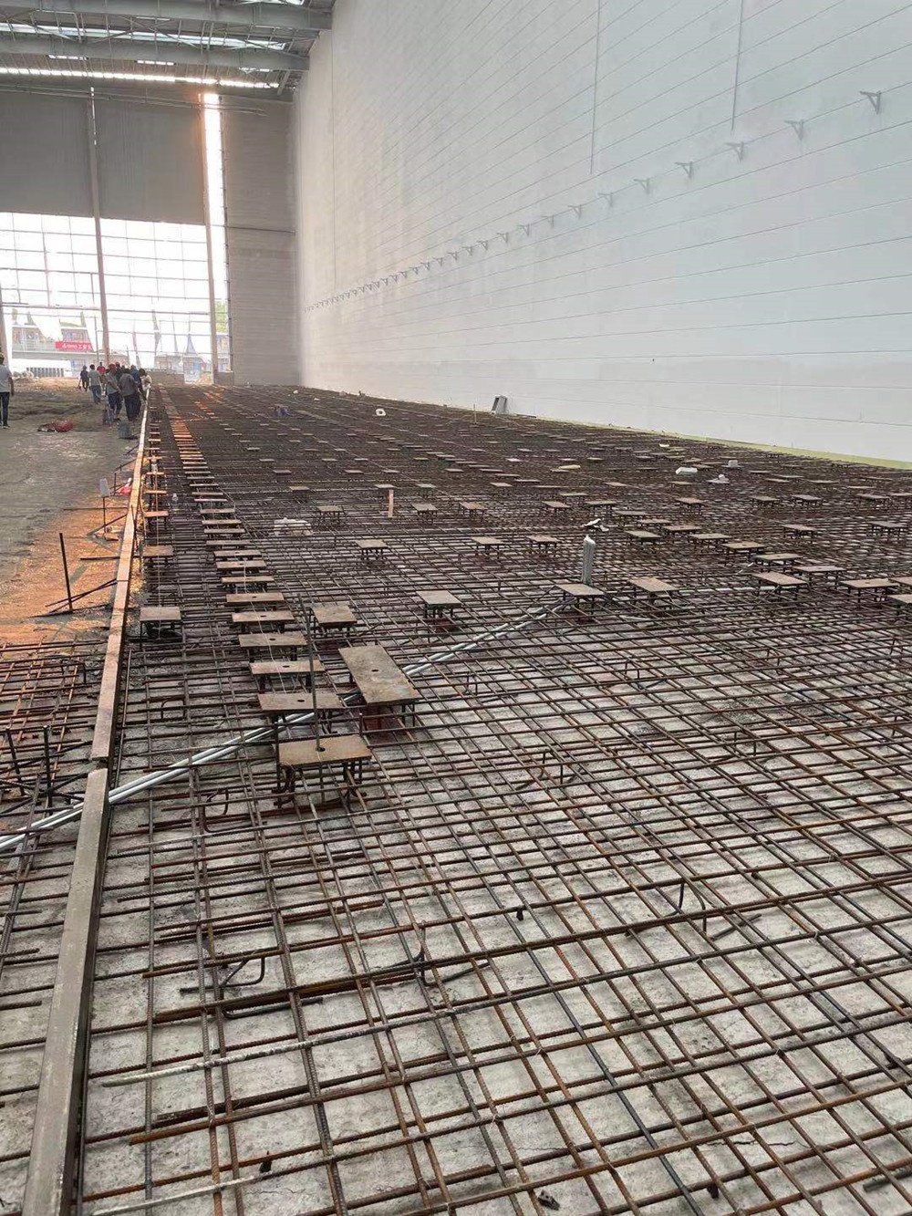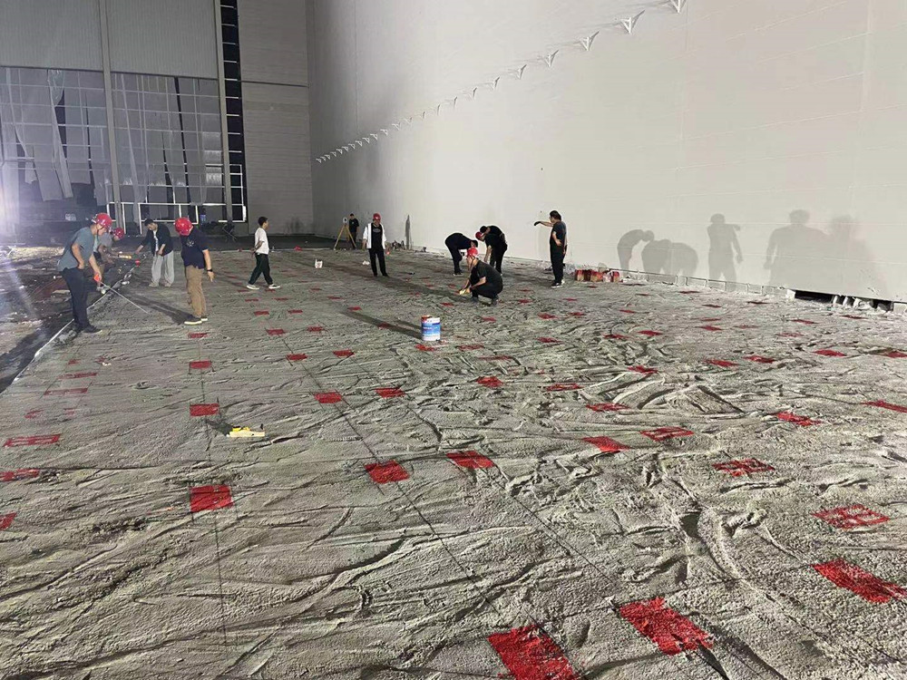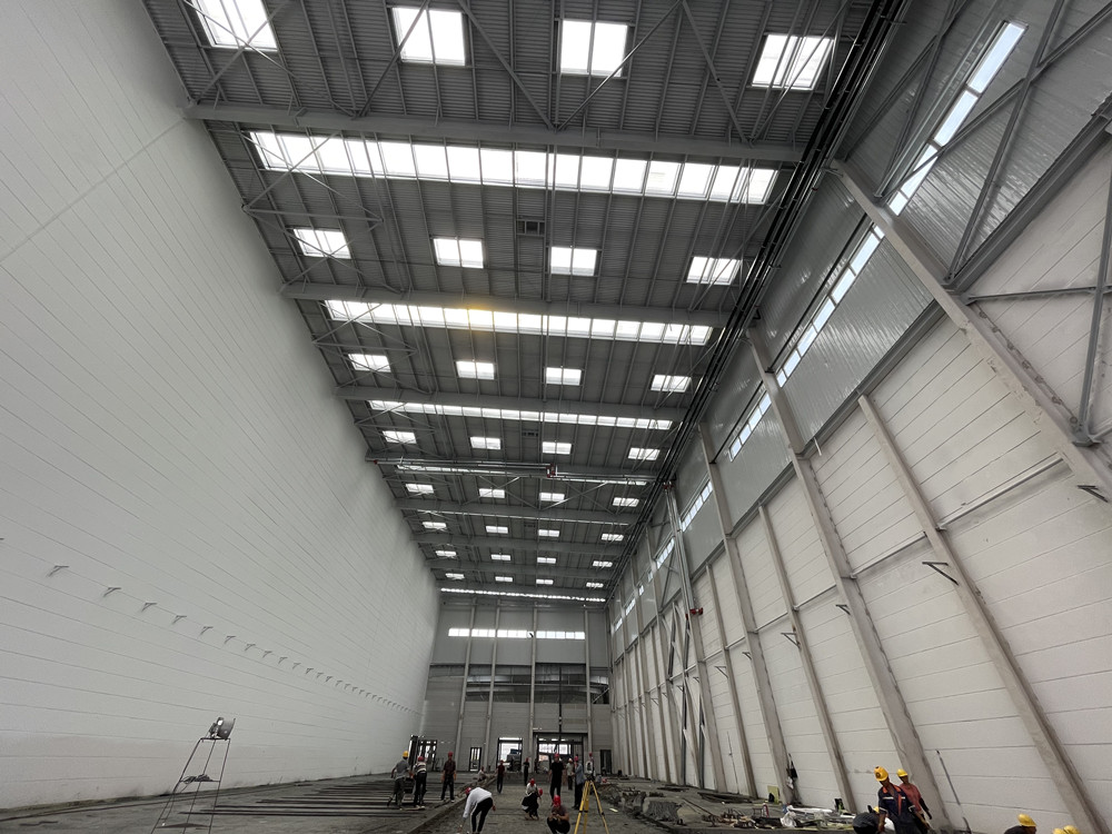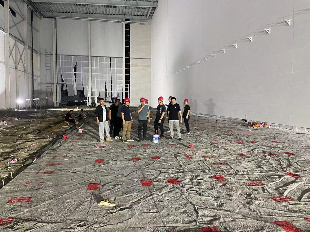 同時進場,分進合擊。隔墻板安裝隊組、地坪隊組、油漆隊組等多家隊組同時入場施工,面對多隊組交叉作業(yè),項目部做好了充分的計劃安排及保障措施。4000多平方米、24米高的立面隔墻板安裝,兩家隊組從東西兩個方向同時安裝,30個工人,耗時140多小時,安裝了2000多塊隔墻板。過程中,安裝隊組攻克了預(yù)制的ALC墻板訂貨周期長、工人在夏季長時間高空作業(yè)等各種困難。油漆隊組緊跟安裝隊組,隔墻板裝好一個工作面就緊跟另一個工作面。墊層、防潮膜、保護層、放線、扎鋼筋、鐵件預(yù)埋、關(guān)模、澆筑地坪……在有限的時間里道道工序,層層把關(guān),都有條不紊地順利完成。