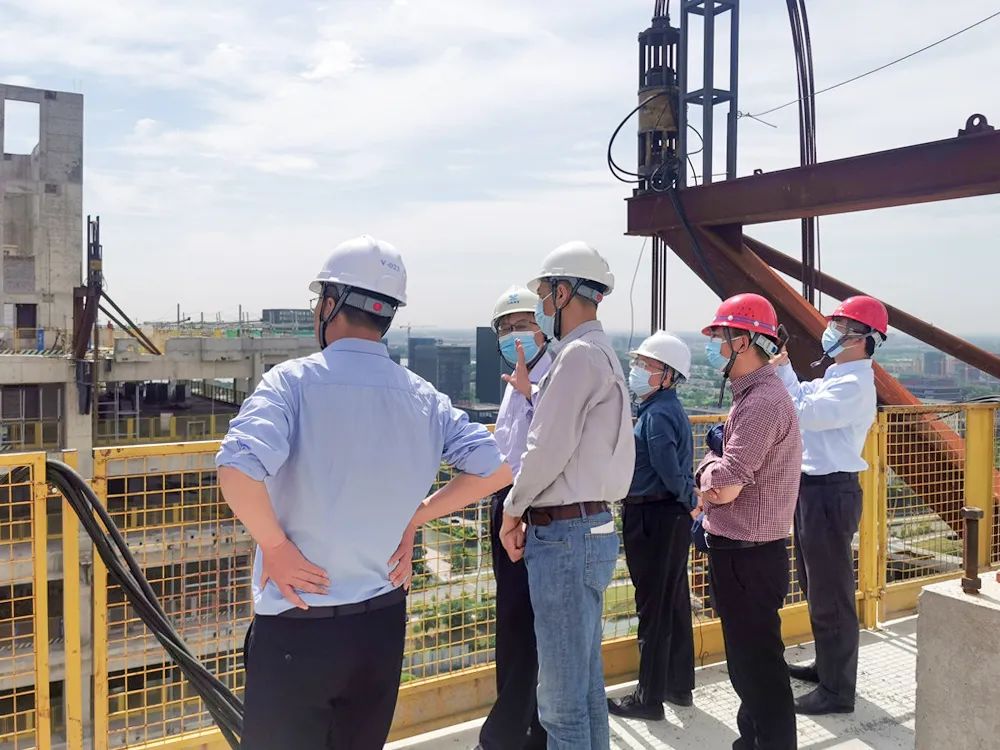 為確保鋼連廊的順利提升,施工期間,集團領(lǐng)導(dǎo)和技術(shù)部門多次來現(xiàn)場進行工作指導(dǎo),邀請了東南大學(xué)郭正興教授來項目對鋼連廊提升的準備工作進行檢查和驗收。
