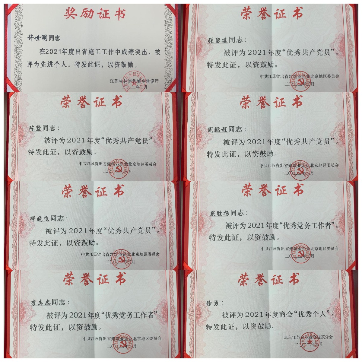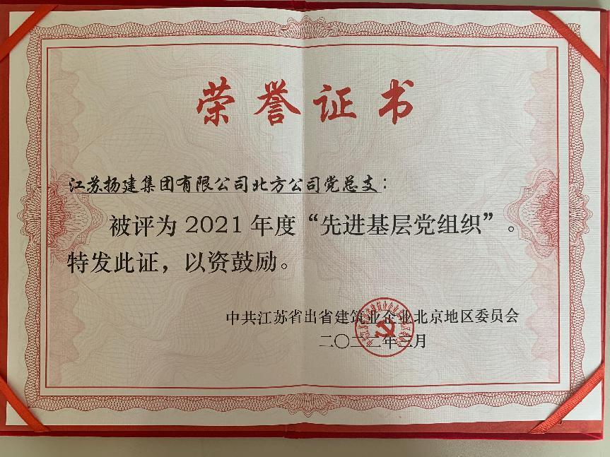 揚建網訊 6月10日,北方公司被江蘇省住房和城鄉(xiāng)建設廳授予“江蘇出省建筑施工先進集體”榮譽稱號;北方公司黨總支被江蘇省出省建筑業(yè)企業(yè)北京地區(qū)黨委會授予“先進基層黨組織”榮譽稱號;北方公司張留建同志、陳墅同志、周鵬程同志、繆曉飛同志被授予“優(yōu)秀共產黨員”榮譽稱號;北方公司李志忠同志、戴勝揚同志被授予“優(yōu)秀黨務工作者”榮譽稱號;北方公司徐勇同志被授予商會“優(yōu)秀個人”榮譽稱號。