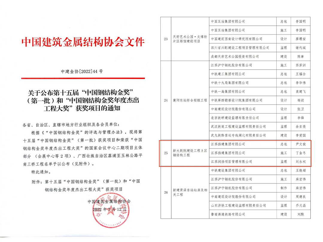 揚建網(wǎng)訊 7月12日,中國建筑金屬結構協(xié)會公布了第十五屆第一批“中國鋼結構金獎”獲獎名單,揚建集團鋼結構公司所承建的運河大劇院建設工程A區(qū)鋼結構工程被正式授予“中國鋼結構金獎”榮譽稱號,并將在2023年全國行業(yè)大會上接受表彰。