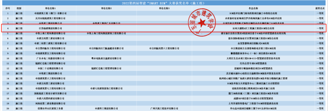 經(jīng)過6月至7月的初賽、復賽答辯,7月6日,揚建集團“運河大劇院A區(qū)BIM應用”在800多個同行作品中脫穎而出,名列施工組第4名,喜獲本次大賽一等獎。