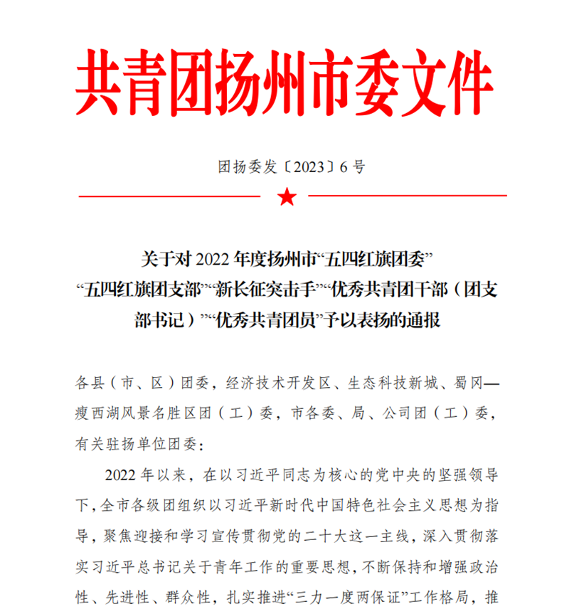 揚(yáng)建網(wǎng)訊 近日,揚(yáng)州團(tuán)市委對(duì)2022年涌現(xiàn)出的先進(jìn)集體和先進(jìn)個(gè)人進(jìn)行了表彰,揚(yáng)建集團(tuán)房軍同志榮獲揚(yáng)州市“新長(zhǎng)征突擊手”稱號(hào)。