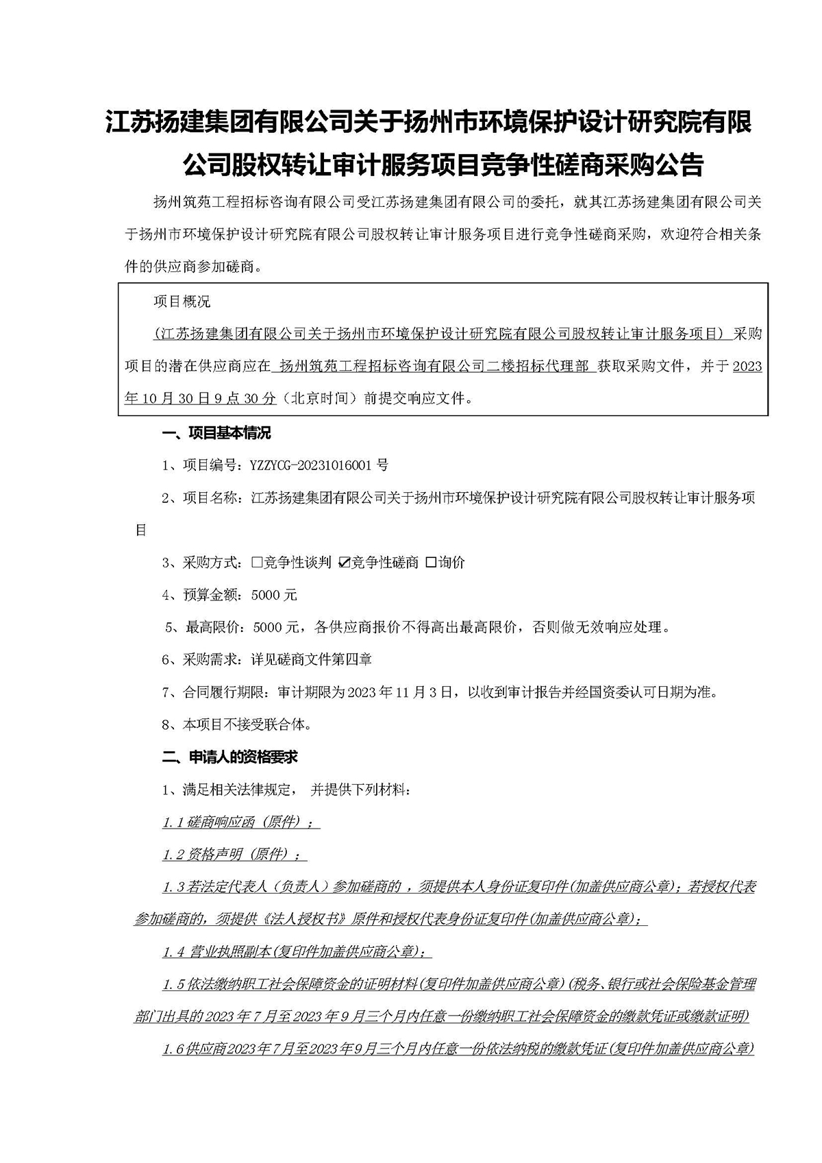 江蘇揚(yáng)建集團(tuán)有限公司關(guān)于揚(yáng)州市環(huán)境保護(hù)設(shè)計(jì)研究院有限公司股權(quán)轉(zhuǎn)讓審計(jì)服務(wù)項(xiàng)目競(jìng)爭(zhēng)性磋商采購(gòu)公告