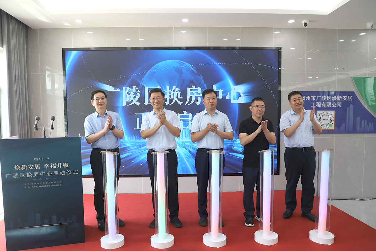 揚(yáng)建網(wǎng)訊 7月24日上午,廣陵區(qū)換房中心啟動(dòng)儀式在揚(yáng)建集團(tuán)福運(yùn)門辦公區(qū)(揚(yáng)州市廣陵區(qū)南通東路80號(hào))隆重舉行。揚(yáng)州市住房和城鄉(xiāng)建設(shè)局黨委書記、局長(zhǎng)徐安朝,廣陵區(qū)委副書記、區(qū)長(zhǎng)郎俊,揚(yáng)州市住房和城鄉(xiāng)建設(shè)局黨委委員、副局長(zhǎng)朱元,江蘇揚(yáng)建集團(tuán)有限公司黨委書記、董事長(zhǎng)康往東出席,廣陵區(qū)委常委、副區(qū)長(zhǎng)王兵,江蘇揚(yáng)建集團(tuán)有限公司總經(jīng)理鄒厚存出席并致辭,市住建局、自然資源和規(guī)劃分局、廣陵經(jīng)開區(qū)、廣陵建工、相關(guān)街道社區(qū)負(fù)責(zé)人以及廣陵區(qū)3大國(guó)有房企負(fù)責(zé)人等領(lǐng)導(dǎo)齊聚啟動(dòng)儀式現(xiàn)場(chǎng),共同見證這一創(chuàng)新時(shí)刻。