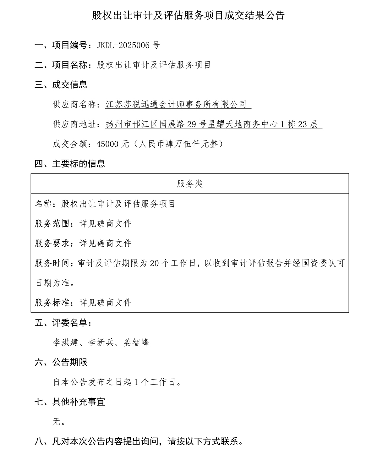 股權(quán)出讓審計及評估服務(wù)項目成交結(jié)果公告
