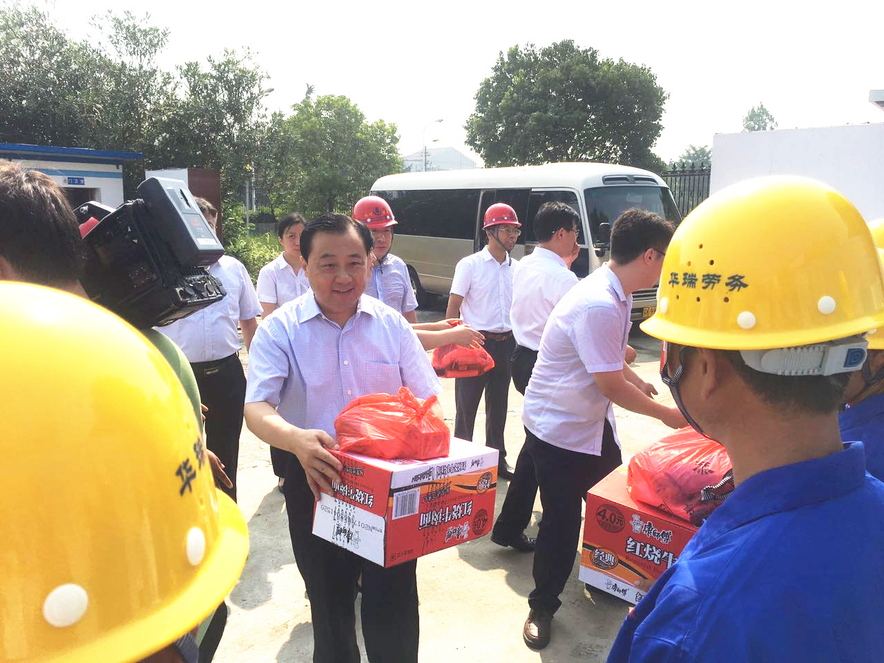揚(yáng)建網(wǎng)訊(三公司 吉習(xí)法)7月27日上午,市委書(shū)記謝正義,市委常委、秘書(shū)長(zhǎng)陳鍇竑,市委副秘書(shū)長(zhǎng)、市委辦主任肖衛(wèi)東等,市城建控股集團(tuán)黨委書(shū)記、董事長(zhǎng)孫建年,副總經(jīng)理于龍珍、周平,市公用水務(wù)集團(tuán)總經(jīng)理嚴(yán)俊泉等,冒著高溫酷暑專(zhuān)程赴集團(tuán)三公司承建的西湖增壓泵站擴(kuò)建工程現(xiàn)場(chǎng)慰問(wèn)一線施工人員。集團(tuán)副總經(jīng)理鄒厚存、劉海斌等領(lǐng)導(dǎo)在現(xiàn)場(chǎng)陪同。